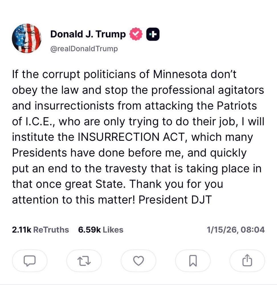 “This is now about far more than Minnesota. This is about all of us. “Don’t take the bait” doesn’t mean that the threat isn’t serious, because it obviously is. This is about being smart as we head into the midterm elections. Nothing has the potential to discourage people from voting like the risk of being pulled out of their car by armed men as they head to their polling places, as ICE did earlier this week to a woman who was on her way to a doctor’s appointment. If Trump deploys the military while voting is underway, the damage could be significant. Donald Trump is well aware of that, and we need to be too.