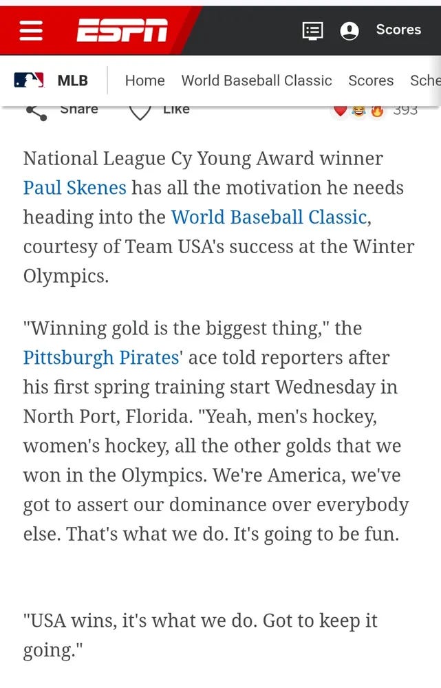 “Except that it wasn’t. The gestures were hollow, performative. The Americans peacocked, on guard in a constant state of war. America alone, standing guard when everyone else was having fun. At the WBC, Team USA seemed not part of a baseball celebration but doing their part for a nonexistent war effort. Only the camo was missing.”