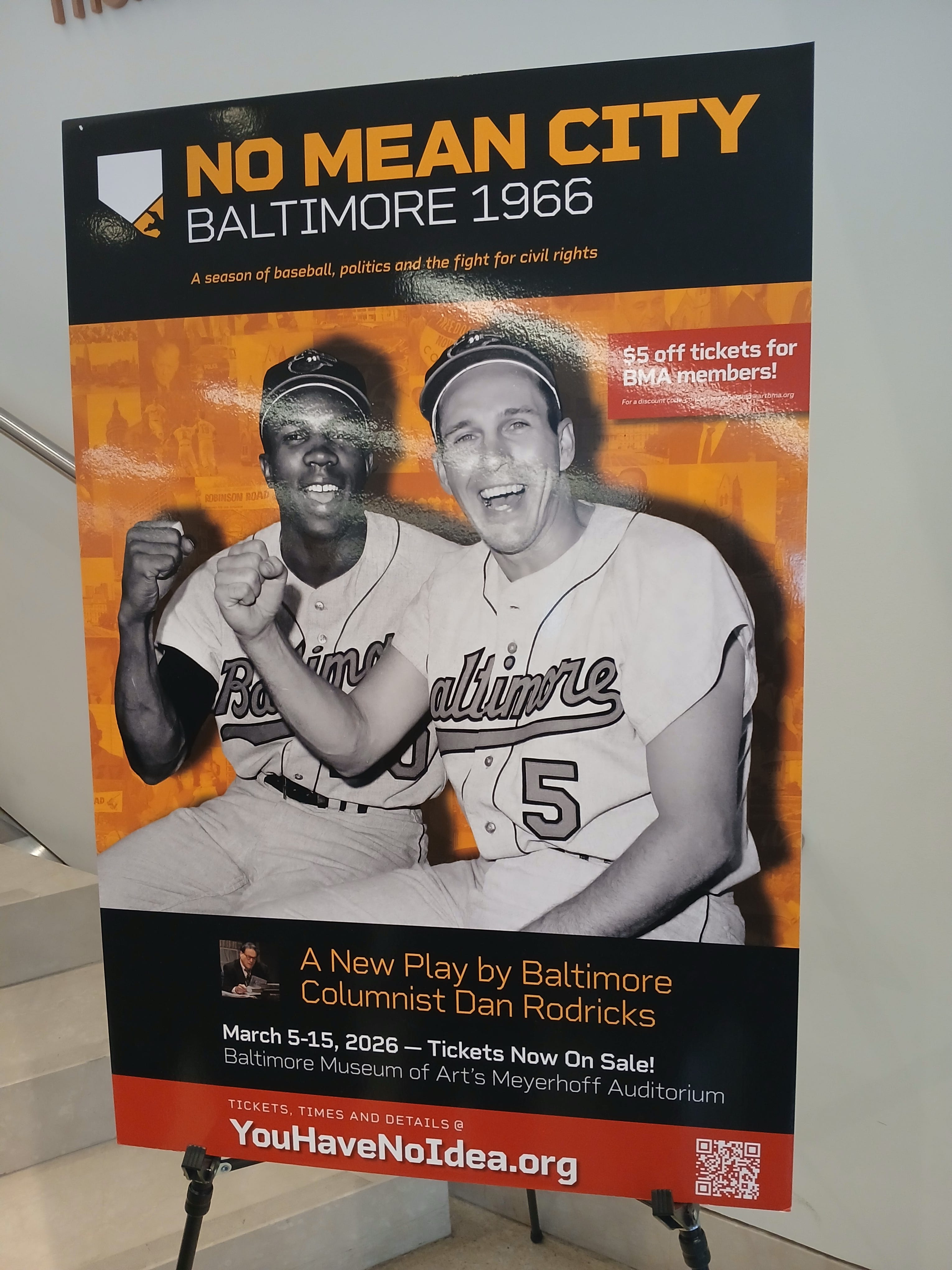 Finally, as if we didn’t have enough drama in our lives, we went to the theatre at the weekend here for one of the final performances in this run of an excellent play, by veteran local journalist and commentator Dan Rodricks, called “No Mean City” about Baltimore in 1966 – told through the narrative combination of the fight for civil rights and the dominant Orioles’ World Series championship, powered by Brooks and Frank Robinson.
