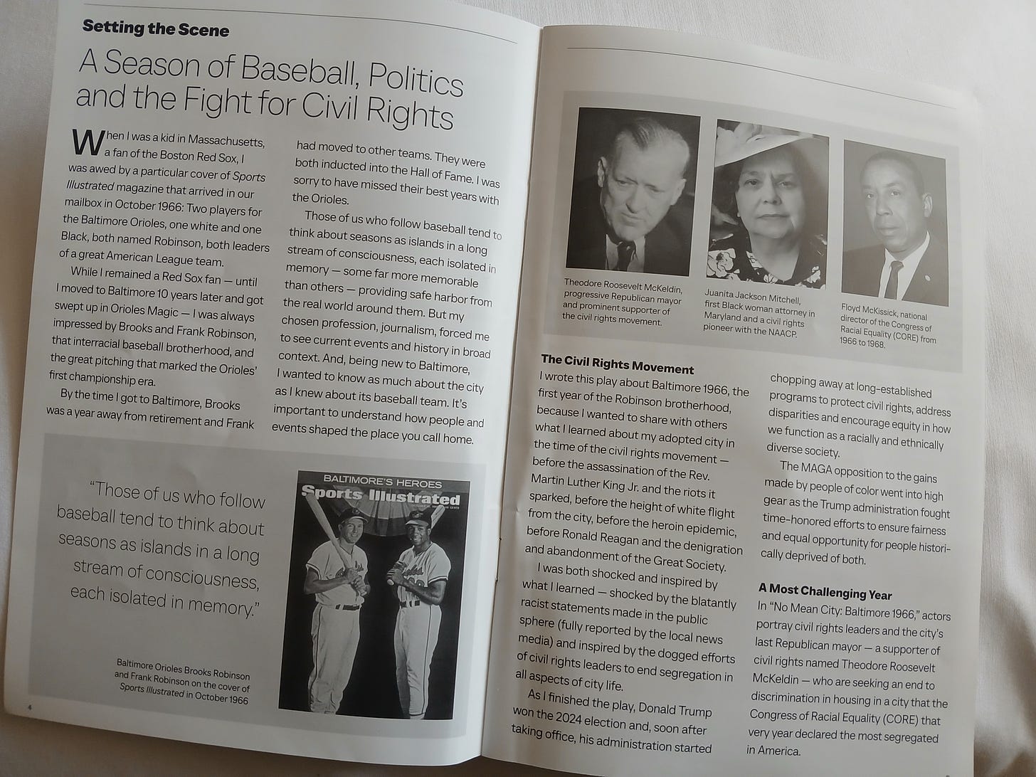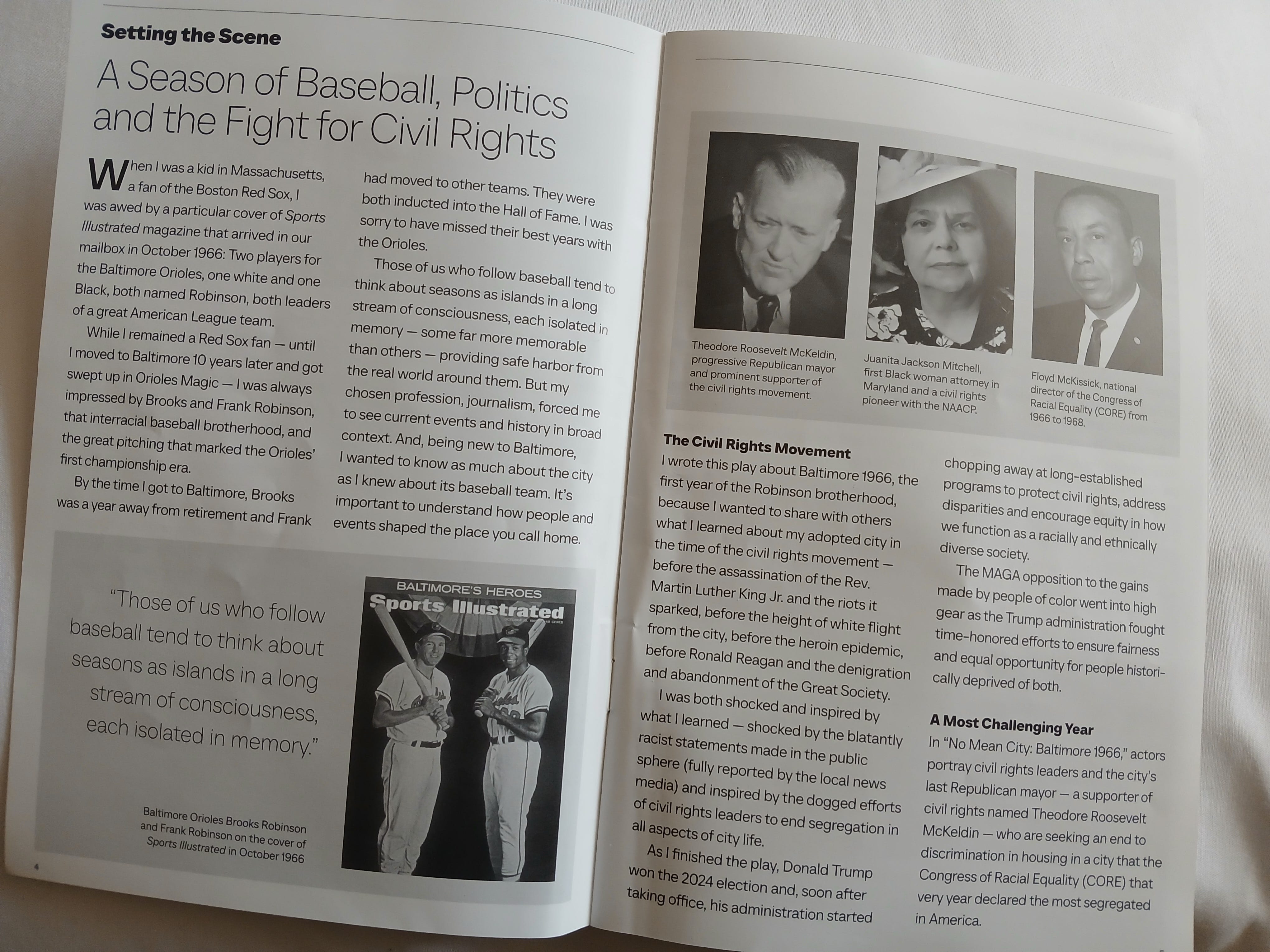 “I wrote a play about Baltimore in 1966, the first year of the Robinson brotherhood, because I wanted to share with others what I learned about my adopted city in the time of the civil rights movement — before the assassination of the Rev. Martin Luther King Jr. and the riots it sparked, before the height of white flight from the city, before the heroin epidemic, before Ronald Reagan and the denigration and abandonment of the Great Society. I was both shocked and inspired by what I learned — shocked by the blatantly racist statements made in the public sphere (fully reported by the local news media) and inspired by the dogged efforts of civil rights leaders to end segregation in all aspects of city life.