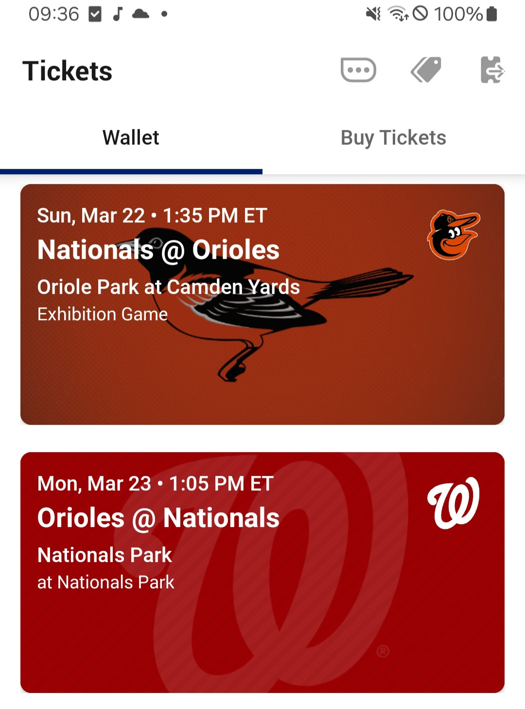 Sunday, 22 March; Baltimore Orioles vs Washington Nationals, Camden Yards, Baltimore MD.