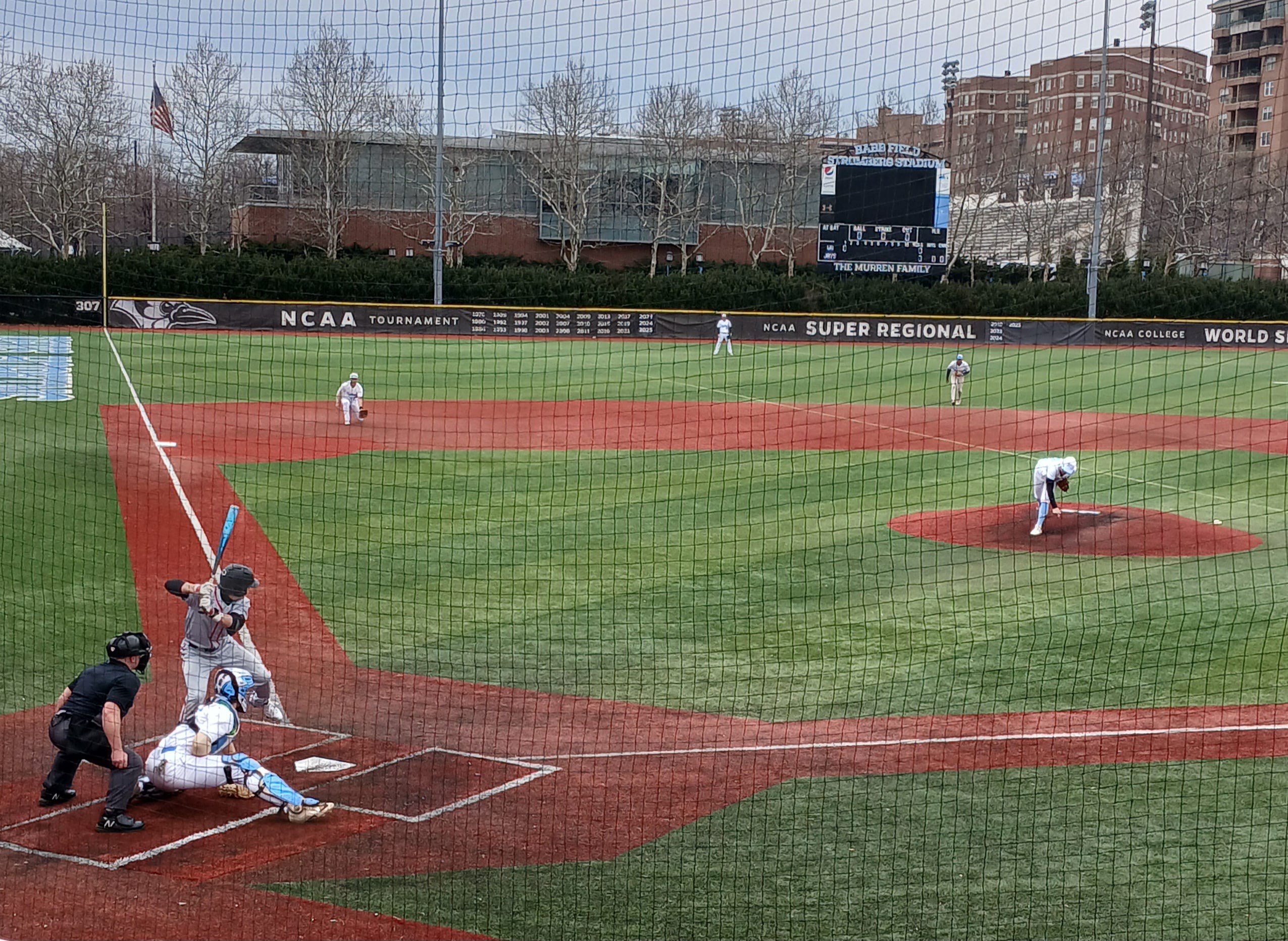 The Blue Jays’ William Moell pitches to Wesleyan shortstop and leadoff man Tucker DeWolf in the first inning of what was my first in-person contest of this season. The at-bat resulted in a walk, with DeWolf then picked off at second.