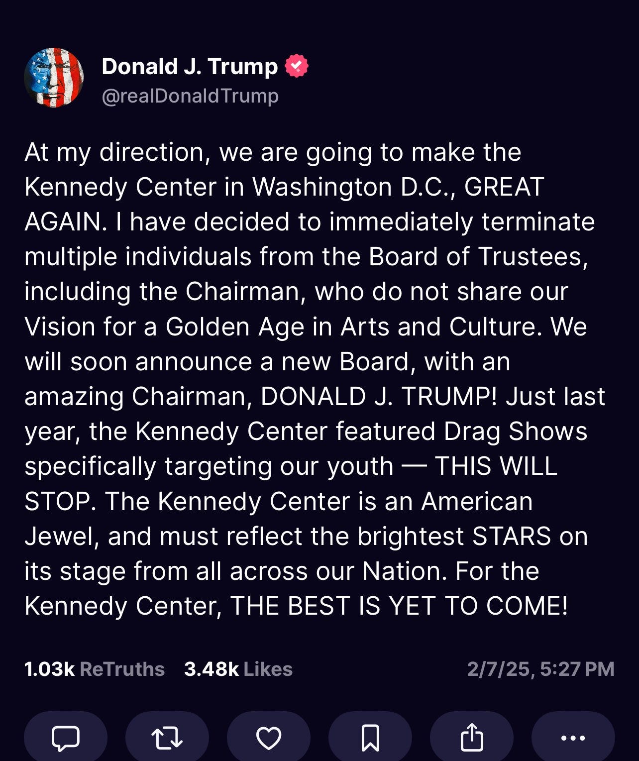 The President also decided this week that he would personally take over the Kennedy Center and get rid of its existing board members, including the chairman, Baltimore Orioles owner David Rubenstein.