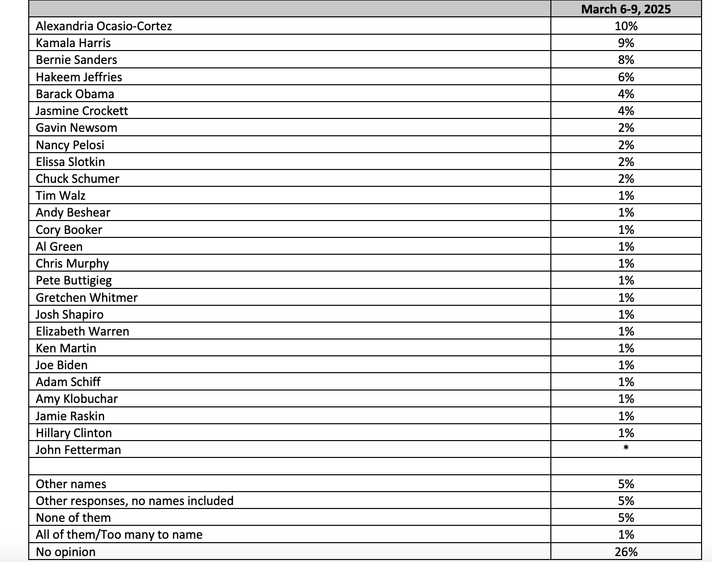 As if to illustrate how disjointed the opposition party is right now, a CNN survey asked respondents to name the “one person who best reflects the core values of the Democratic Party?” It was a long list.